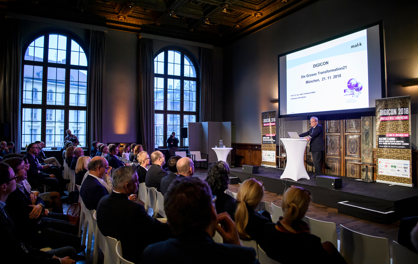Vor einem vollen Haus, mit Teilnehmerinnen und Teilnehmern von über 200 Firmen, hielt Prof. Fredmund Malik auf der DIGICON 2018 einen Vortrag über „Die Grosse Transformation21“. Die DIGICON ist ein wichtiges Treffen, wenn es um zukunftsweisende Ideen und neueste Entwicklungen im Bereich der Digitalisierung geht. 2018 stand die DIGICON in München unter dem Thema „Machine Learning – Impulse durch Quanten Computing, Data Mining und Reinforcement Learning”. (Fotos: Copyright – Koch/Digitale Welt Academy)